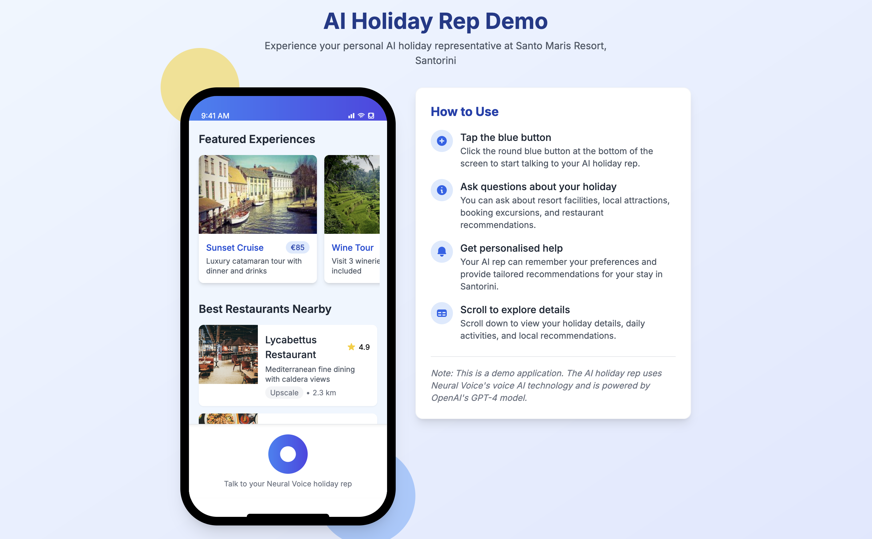 AI Travel AgentExperience a Travel Voice travel agent having natural conversations with customers to find their dream holiday. Our AI will speak with customers, understand their preferences, and send them to direct booking pages for flights and hotels, plus email a complete itinerary.